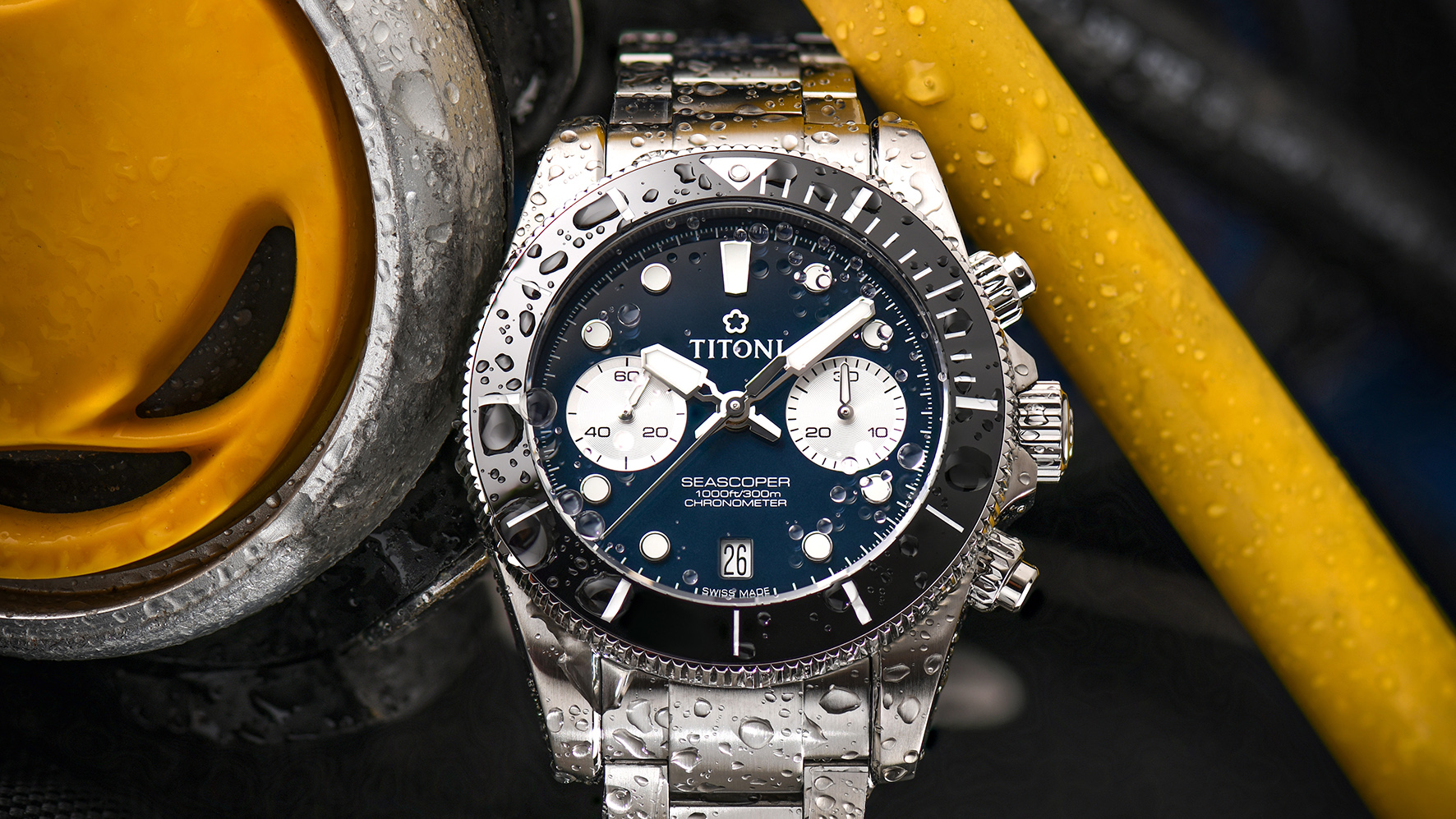 Das massive 41mm-Edelstahlgehäuse schützt das COSC-zertifizierte Automatikwerk Sellita SW510 BH zuverlässig vor Wasser, Druck, Stößen und Staub. Die Seascoper 300 Bicompax-Chronographen werden im hauseigenen Atelier in Grenchen gebaut, reguliert und geprüft, bevor sie das Haus verlassen. Das Edelstahlgehäuse und eine spezielle Kronendichtung garantieren Wasserdichtigkeit bis 300m. Verschraubte Chronographendrücker verhindern eine versehentliche Fehlbetätigung unter Wasser. Die einseitig drehbare Keramiklünette, eingefasst in Stahl mit griffigem Rand, bietet höchste Kratzfestigkeit und optimale Bedienbarkeit – auch im Einsatz unter Wasser.
