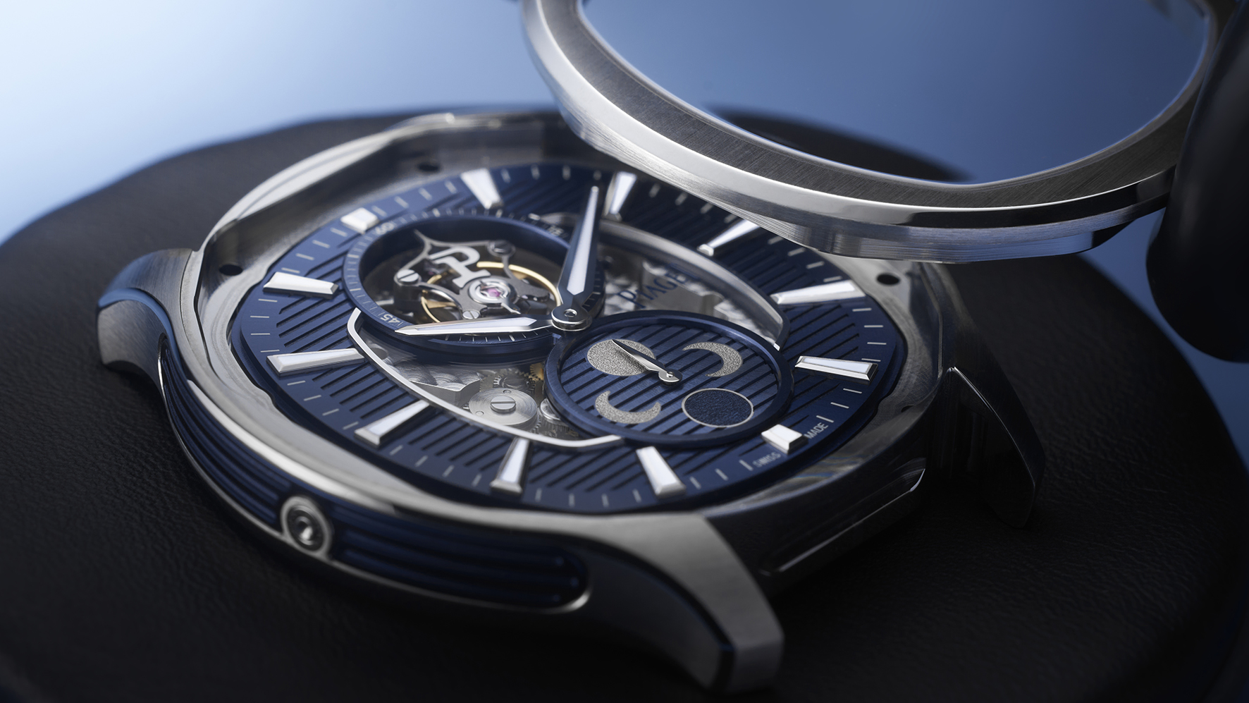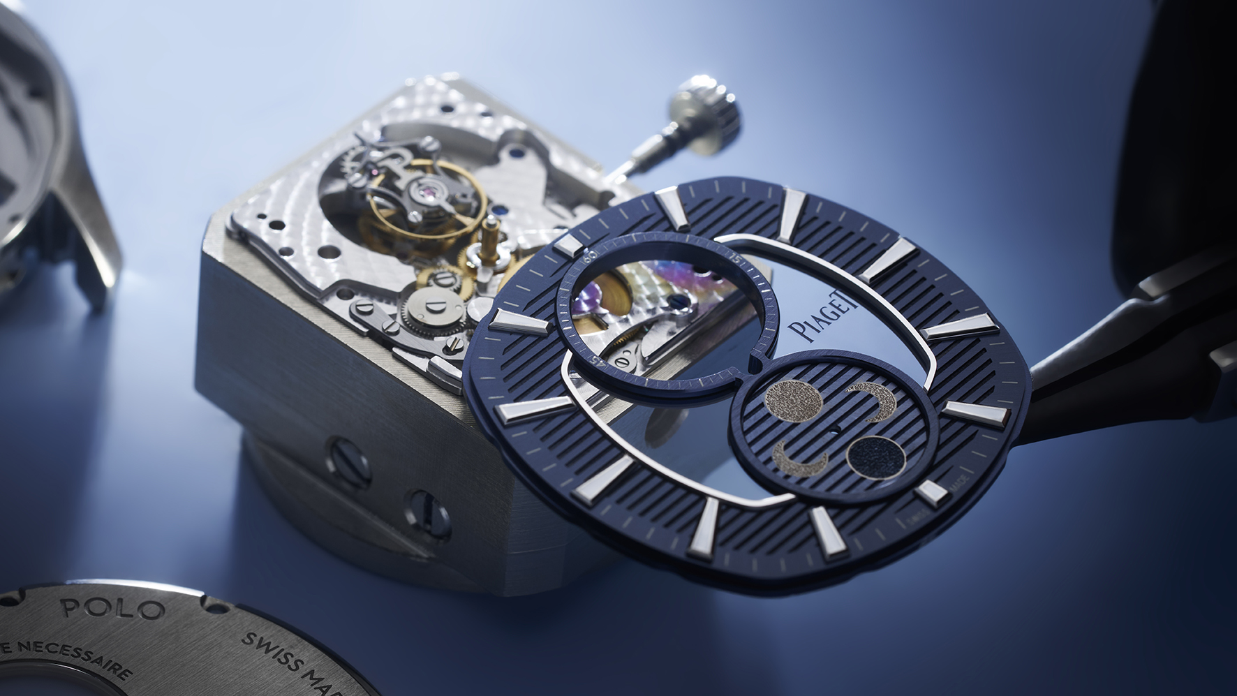 Diese für Piaget charakteristische ästhetische Signatur wird durch ein weiteres, tief in der Technik verwurzeltes Designmerkmal ergänzt. Mit einer Bauhöhe von 9,8 mm ist die Piaget Polo Flying Tourbillon Moonphase ein Paradebeispiel für die ultraflache Uhrmacherei, zu dem nicht zuletzt das lediglich 4 mm hohe Kaliber 642P entscheidend beiträgt. Geschützt wird das sensible Innenleben der Piaget Polo Flying Tourbillon Moonphase von einem Titangehäuse mit einem Durchmesser von 44 mm und sich abwechselnden polierten und satinierten Oberflächen.